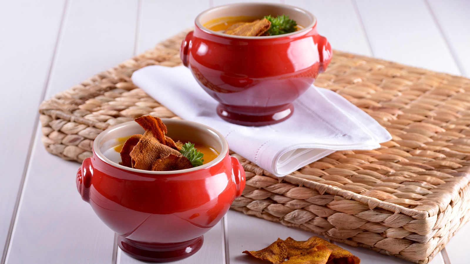Servimos nuestra crema adornando con un montoncito de chips de zanahoria, un hilo de la crema de coco y jengibre y cebollino fresco.