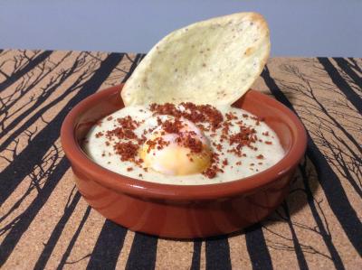 Crema picante de patata con huevo, galleta de mostaza maille al vino blanco y polvo de ibérico