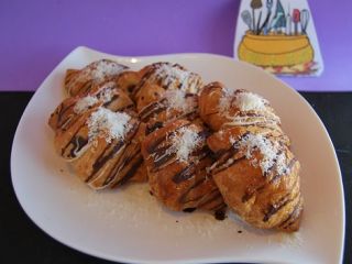 Poner el relleno en el lado más ancho del triangulo (sin pasarnos en exceso) y enrollar, empezando por lo más ancho hasta la punta.