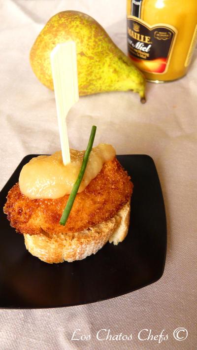 Croqueta de parmesano con mermelada de pera y mostaza a la miel
