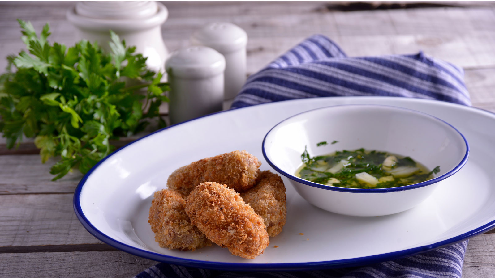 Croquetas de pezuñas de cerdo con dip español de perejil, ajo, aceite y queso