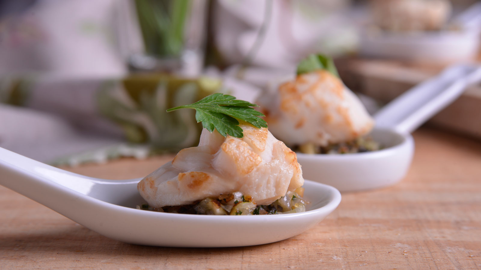 Servimos las vieiras rápidamente en las cucharitas que teníamos preparadas y las decoramos con un poco de cebolleta, cebollino picados.