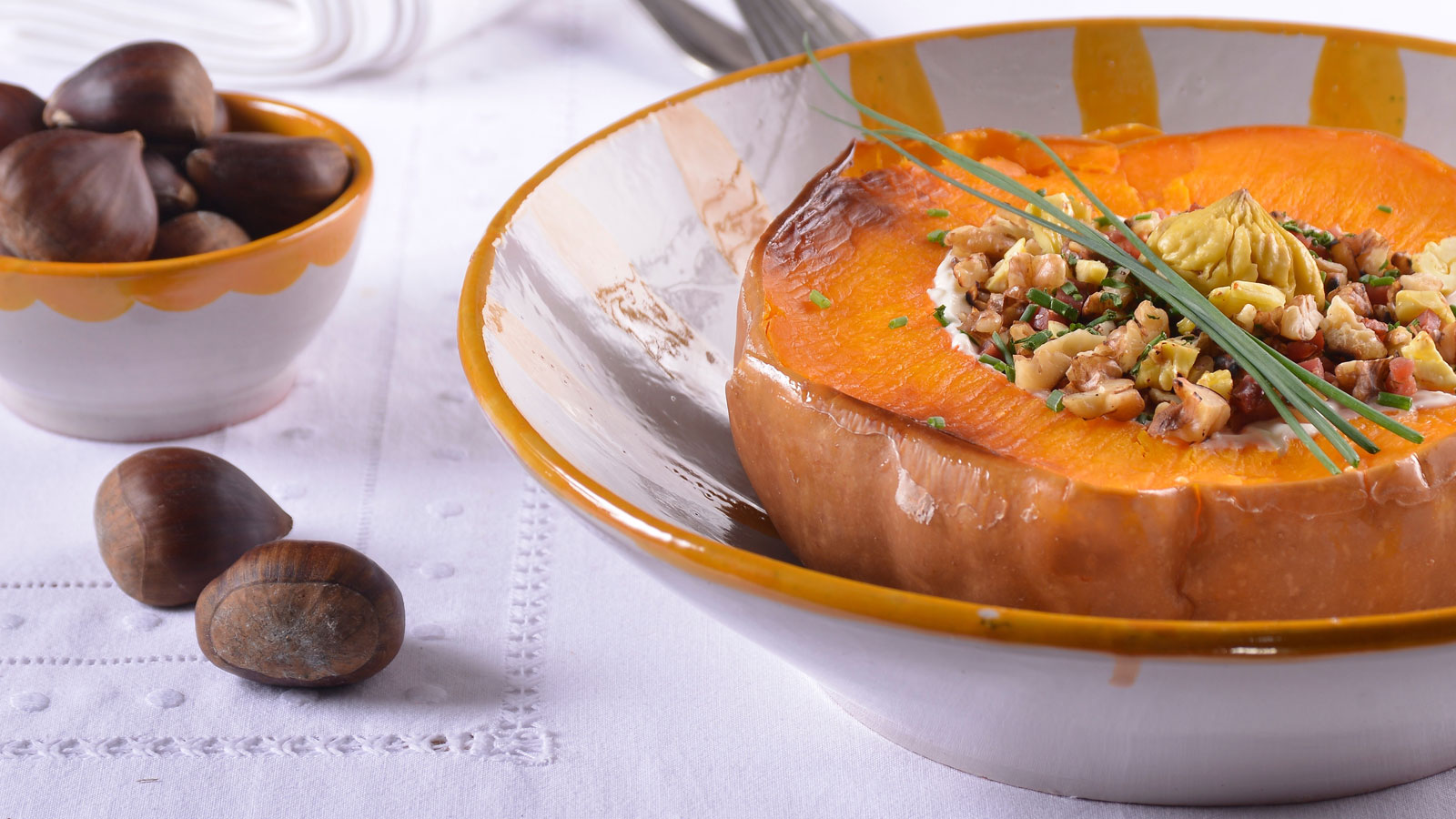 Para preparar esta receta lo ideal es hacerlo con calabazas pequeñas que nos permitan al cortarlas a lo ancho obtener dos cuencos.