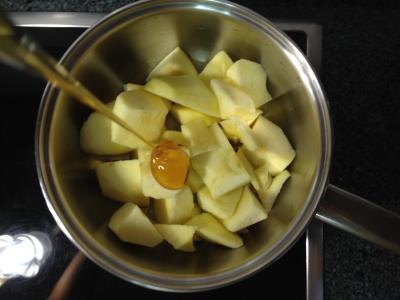 Antes de empezar con la masa, preparamos la compota de manzana que va a llevar mezclada. Para ello, pelamos y cortamos dos manzanas en varios trozos (no muy pequeños) y los ponemos en un cazo junto con la miel a fuego bajo, tapamos y dejamos cocinar una hora. Sacamos la compota del fuego cuando esté hecha puré y la ponemos en un bol, reservamos y esperamos a que llegue a temperatura ambiente.