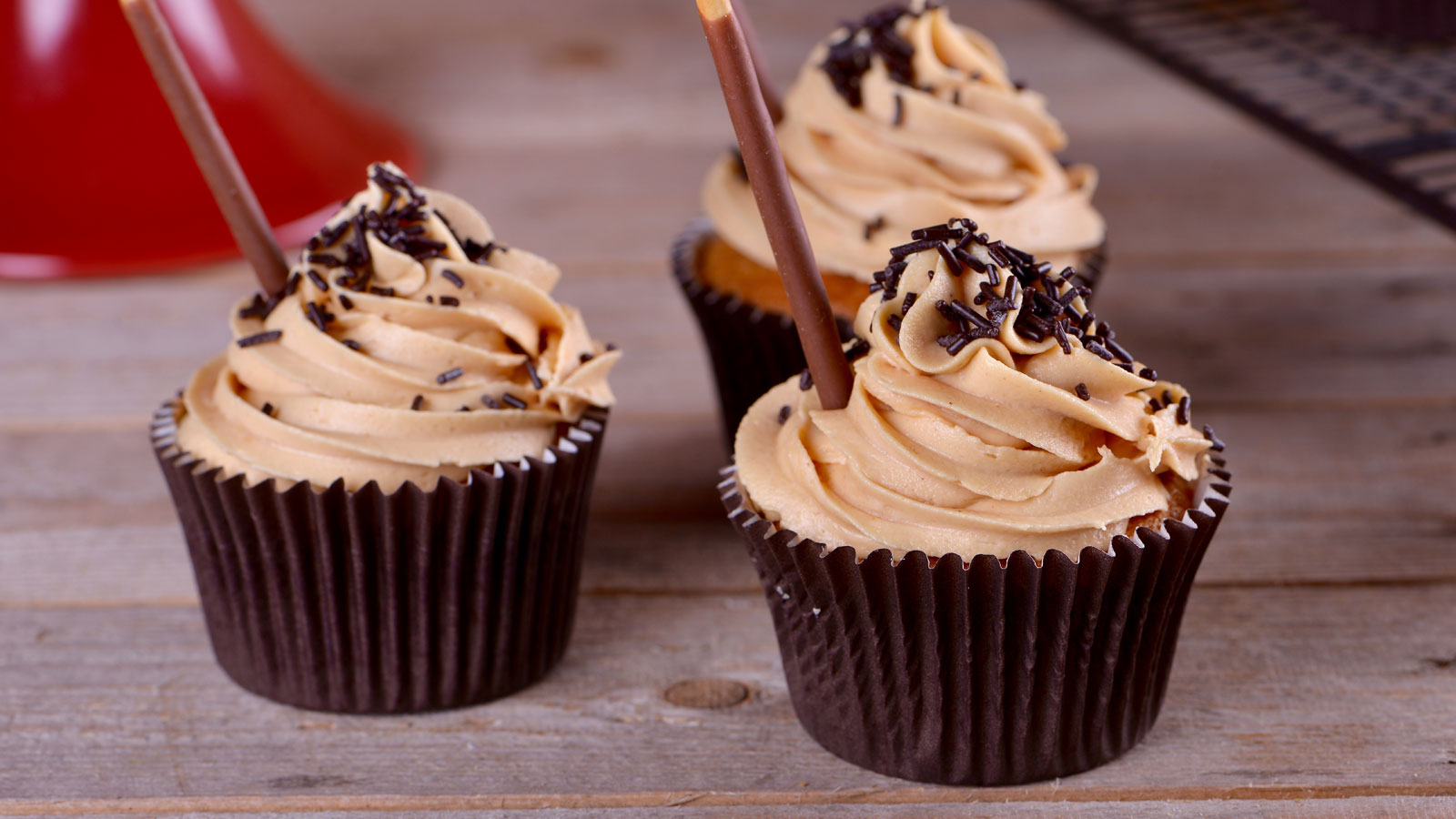 Cuando los cupcakes estén fríos, colocamos encima de cada uno de ellos un poco de crema de cacahuetes con la manga pastelera. Para decorarlos, podemos añadir sprinkles de chocolate y servimos.