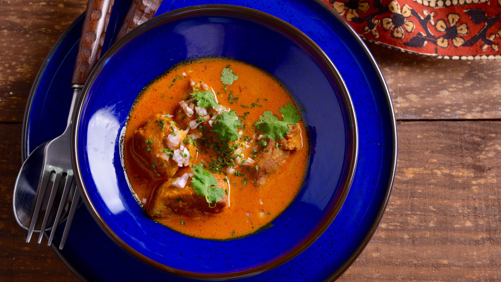 Pasado ese tiempo, incorporamos las especias en polvo a la sartén del sofrito: comino en polvo, coriandro en polvo, cúrcuma, pimentón y madras masala. Mezclamos con el yogur y vertemos el caldo de cordero. Dejamos que reduzca hasta un poco menos de la mitad.