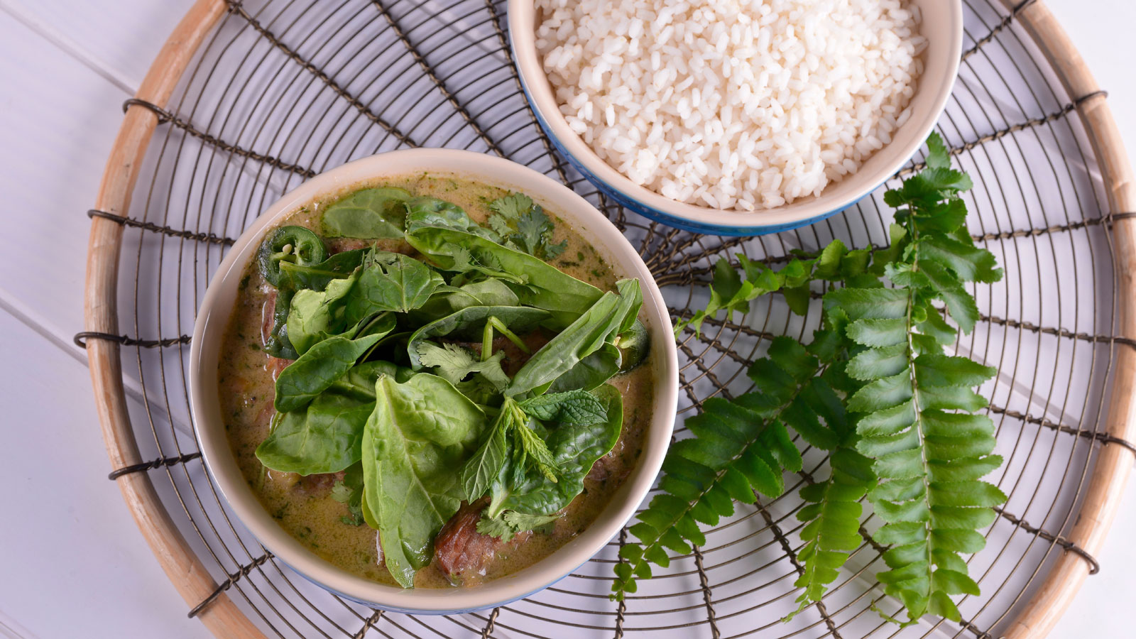 Servimos el curry verde de ternera con 200 g de arroz blanco cocido.