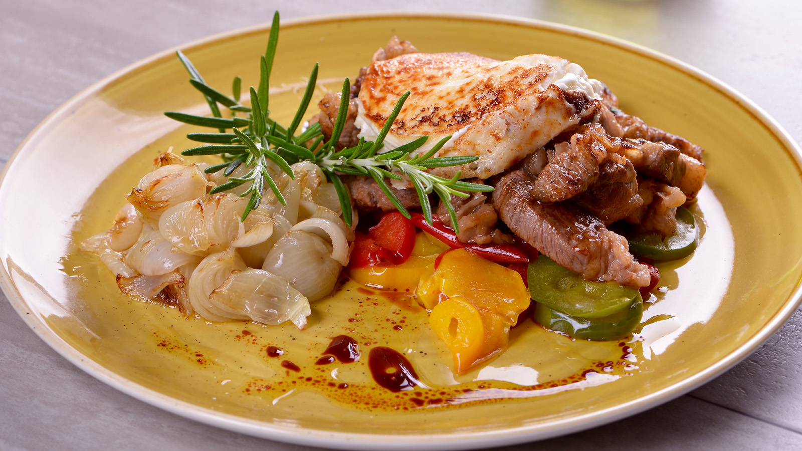 Pasamos por la plancha el queso de cabra y servimos el queso en medio rodeado de los daditos con la verdura fritita y una ramita de romero.