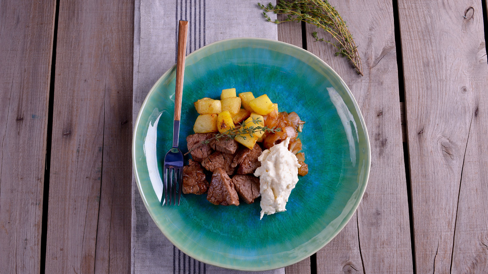 Servimos los dados de carne y patata, la cebolla caramelizada y acompañamos con la salsa de mostaza y una yema de huevo cruda.