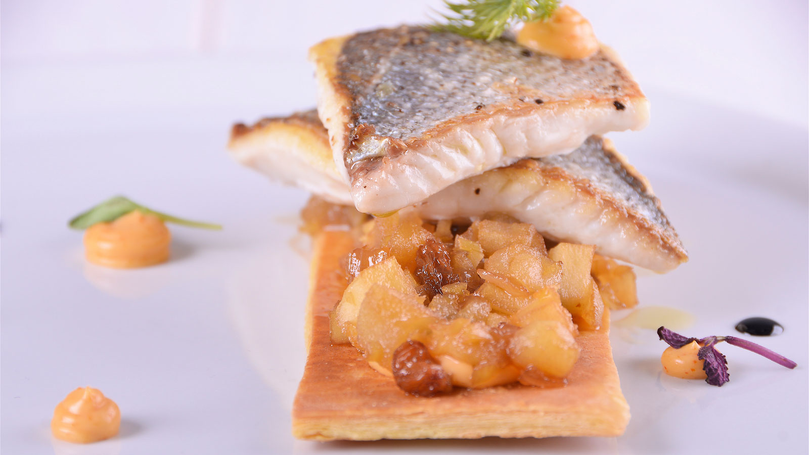 Servimos disponiendo el hojaldre con unos puntitos de mayonesa. A continuación una buena cucharada de chutney, y por encima, el pescado.