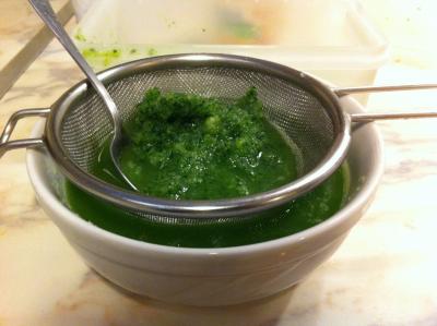 una pizca de sal, 3 gotas de tabasco, el zumo de media lima, y se tritura. Se deja reposar 30 minutos para que coja la pigmentación verde. Por último, se pasa por un colador para que quede fino.