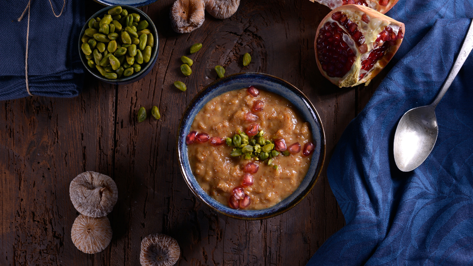 Repartimos en tazas y decoramos con pistachos picados y granos de granada.