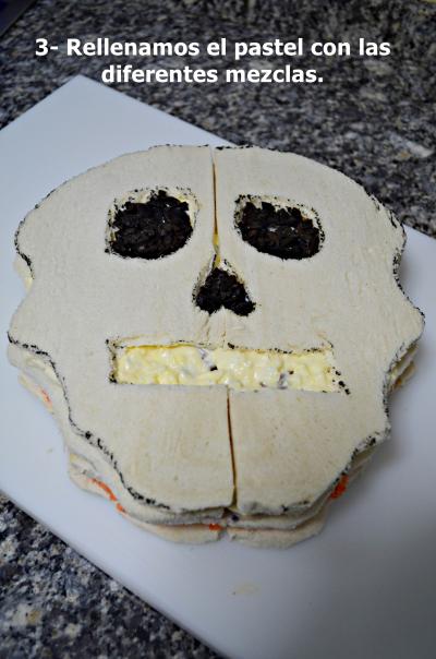 Alternamos las capas de pan con las diferentes farsas. El orden es irrelevante. Cuando esté el pastel ya montado quedarán los huecos de los ojos, la nariz y la boca en la parte superior. Los rellenamos con aceituna negra picada para darle mayor dramatismo.