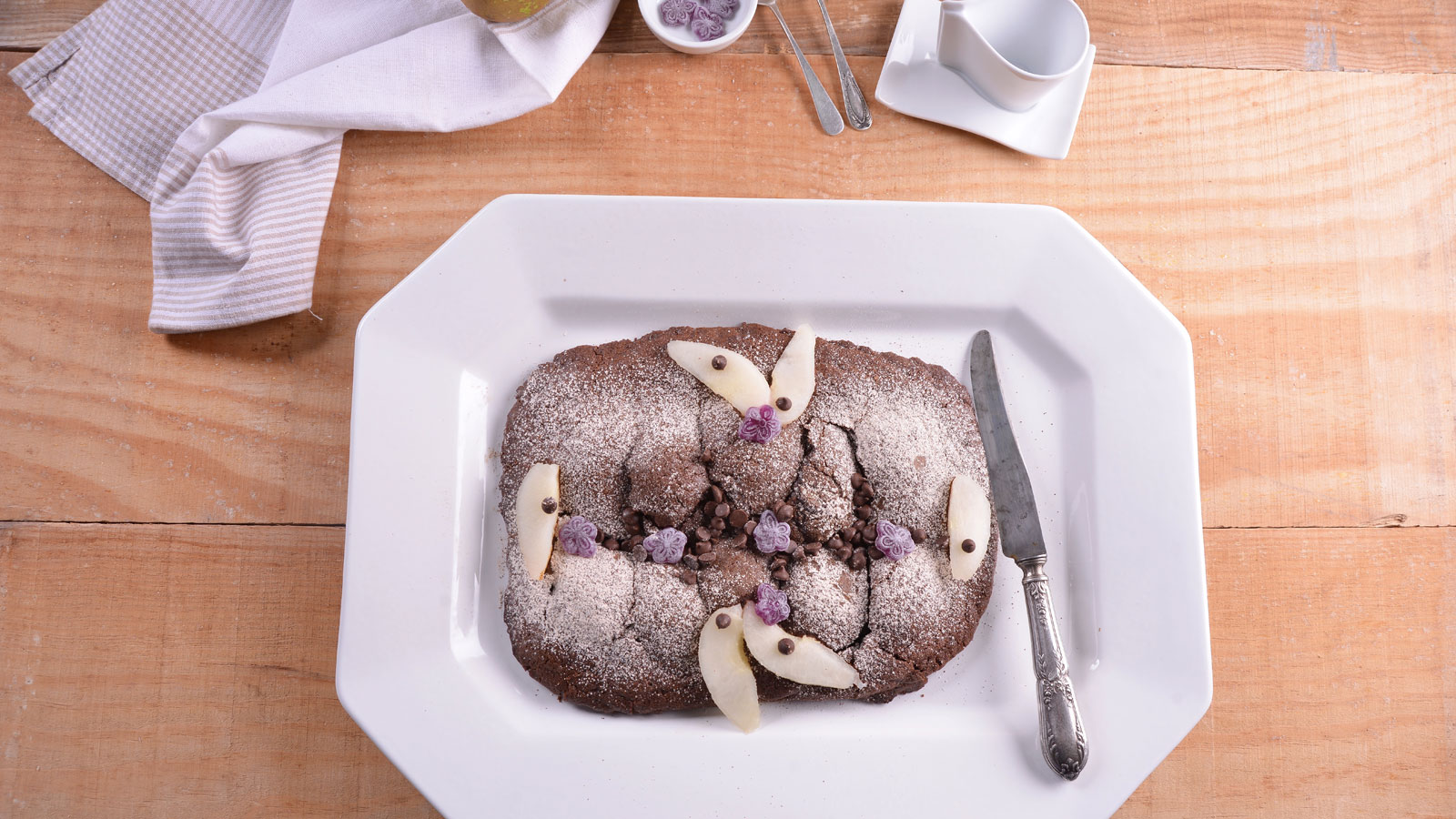 Extraemos la empanadilla del horno y la dejamos enfriar unos minutos. Espolvoreamos un poco de azúcar glas por encima. Decoramos con unos gajos de pera, unos chips de chocolate y unos caramelos de violetas.