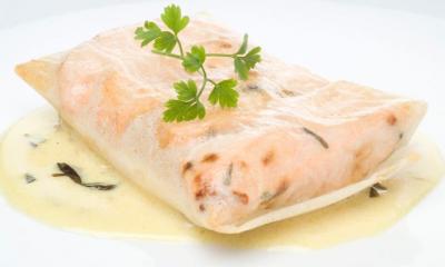 Rellenar la pasta filo con el relleno de salmón y cerrarlos en forma de paquetitos cuadrados o con la forma que se desee.