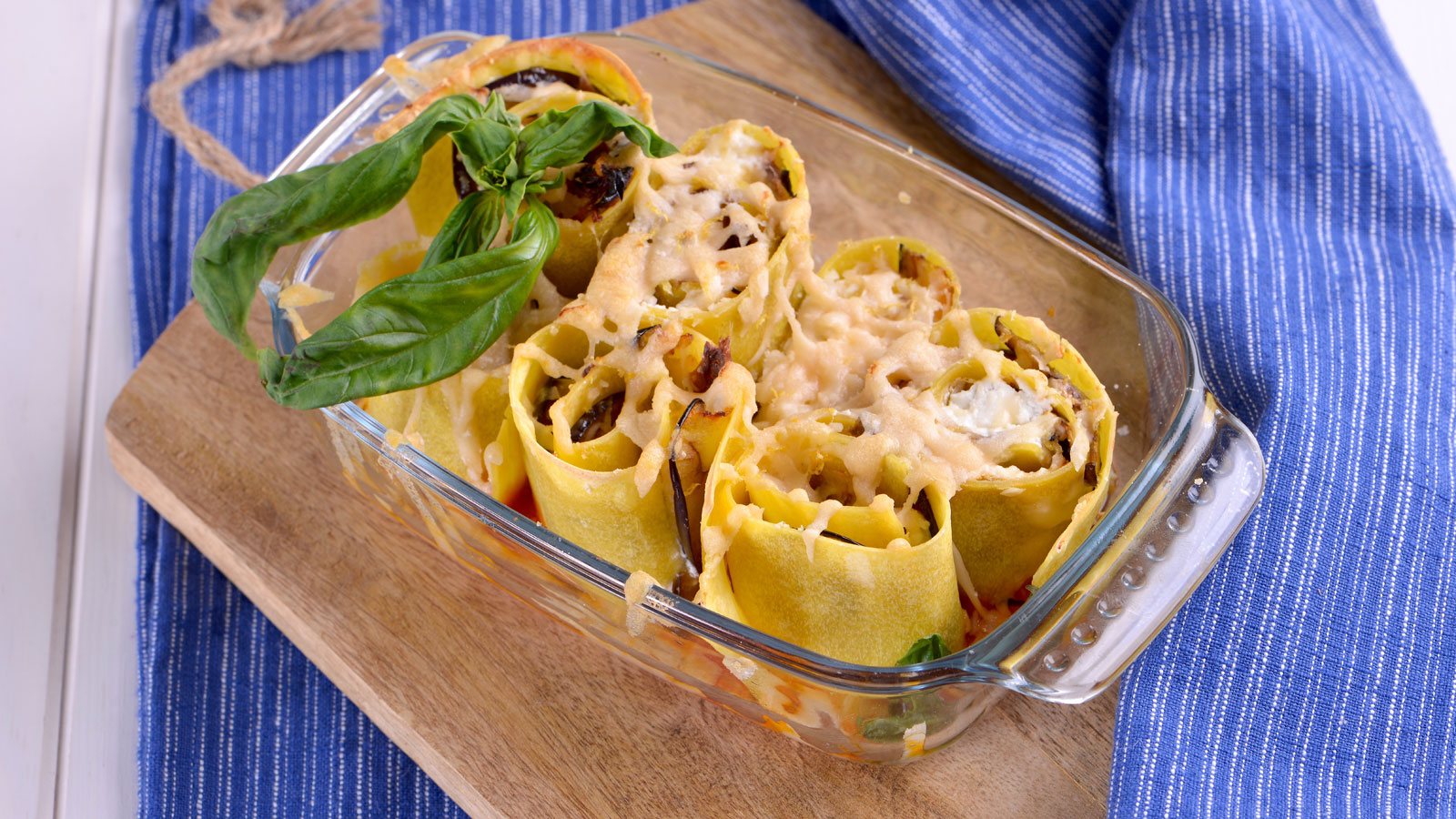 Rellenamos la pasta con la ricota, la berenjena, las anchoas, un poco de parmesano y enrollamos.