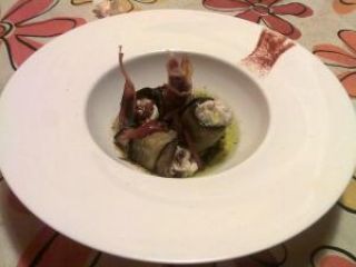 Ensalada de berenjena con crema de nueces y jamÓn de bellota.