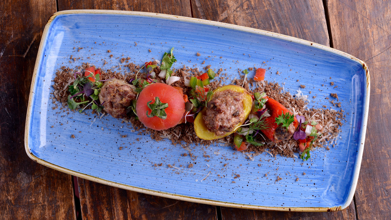 Después, rellenamos las verduras con la carne picada y las colocamos en un recipiente apto para horno, las regamos con aceite y horneamos a 180ºC durante 30 minutos.