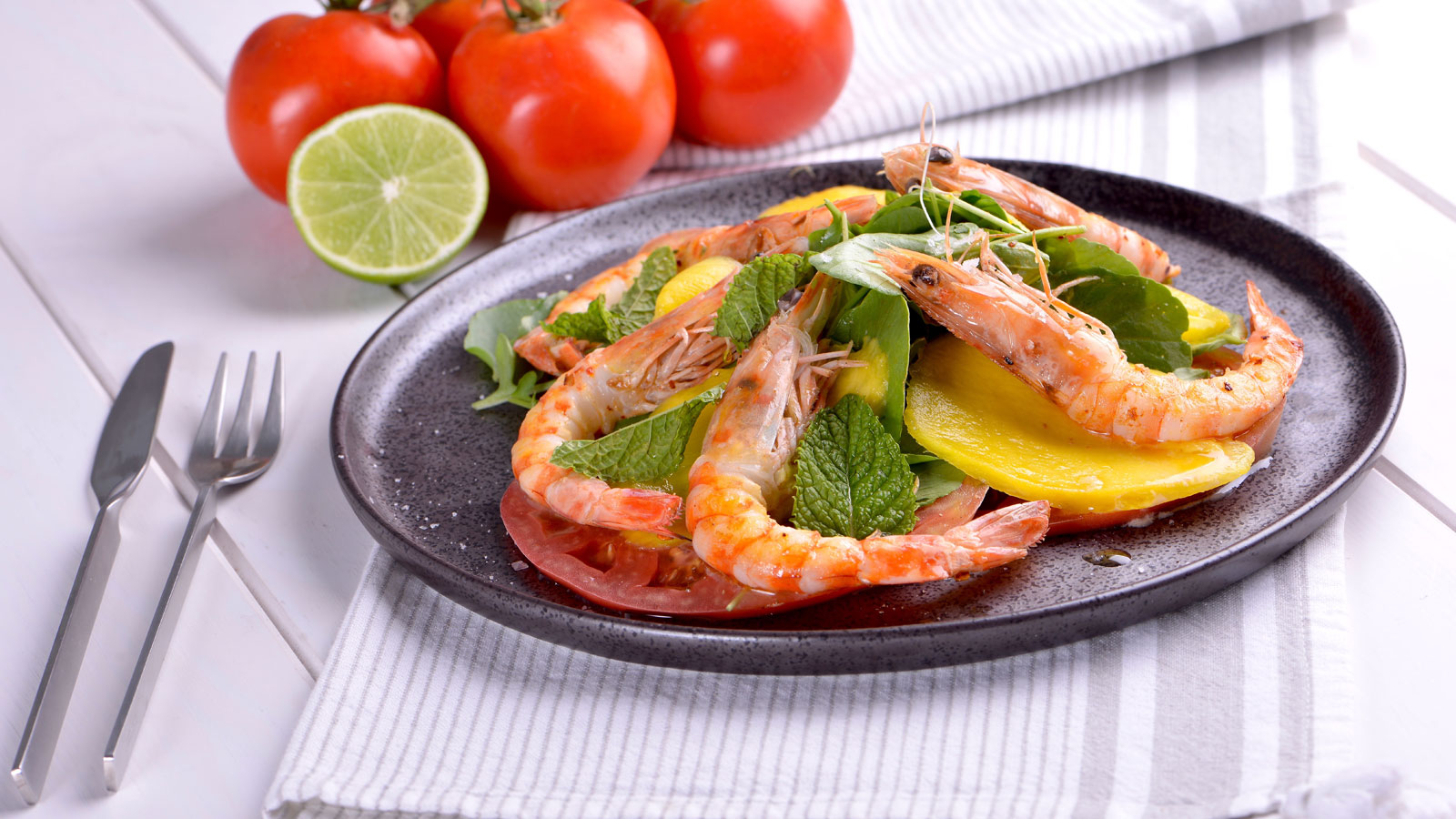 Terminamos la ensalada acomodando un montoncito de berros al centro, sobre el tomate colocamos unas láminas finas de mango cortado al momento y los langostinos.