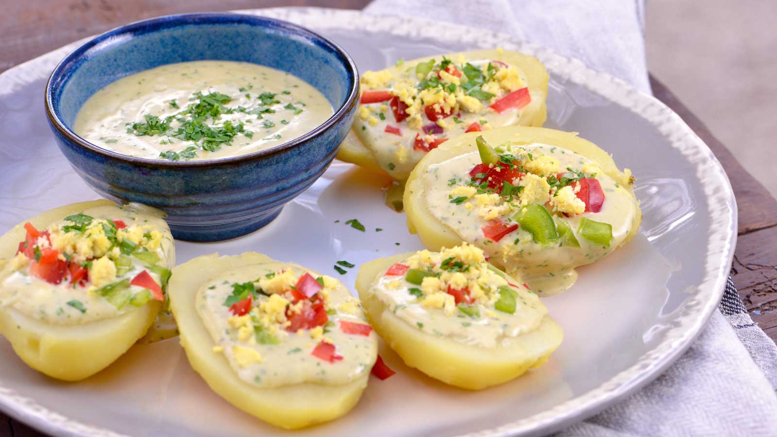 Servimos la mayonesa con las patatas cortadas por la mitad, la mayonesa de anchoas, los pimientos y los huevos picados y perejil picado por encima.