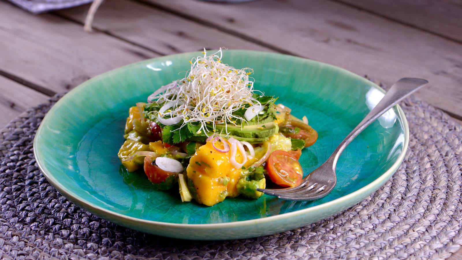 En el capítulo 1 del programa de televisión La cocina de la felicidad, Marta Simonet prepara la receta de Ensalada de aguacate con mango.