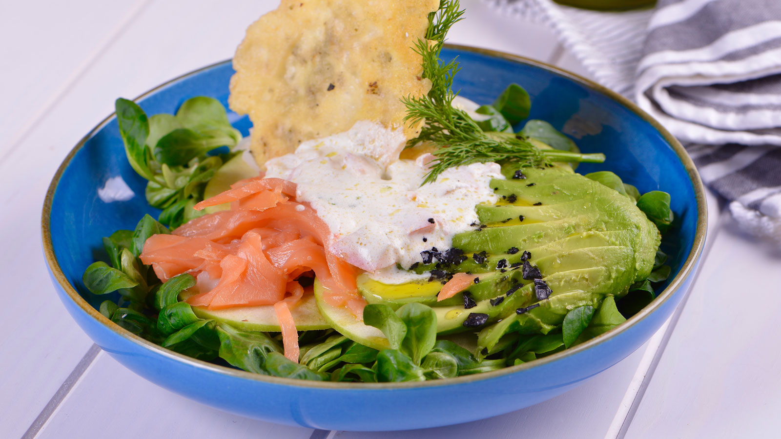 Lo primero que tenemos que hacer es preparar el aliño. Para ello mezclamos en un bol un yogur griego, el zumo de una lima y su ralladura, un chorro de aceite de oliva virgen extra, una rama de eneldo fresco y pimienta al gusto.