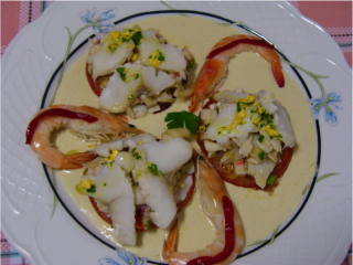 Ensalada de bacalao y txangurro con langostinos sobre salsa de antxoas