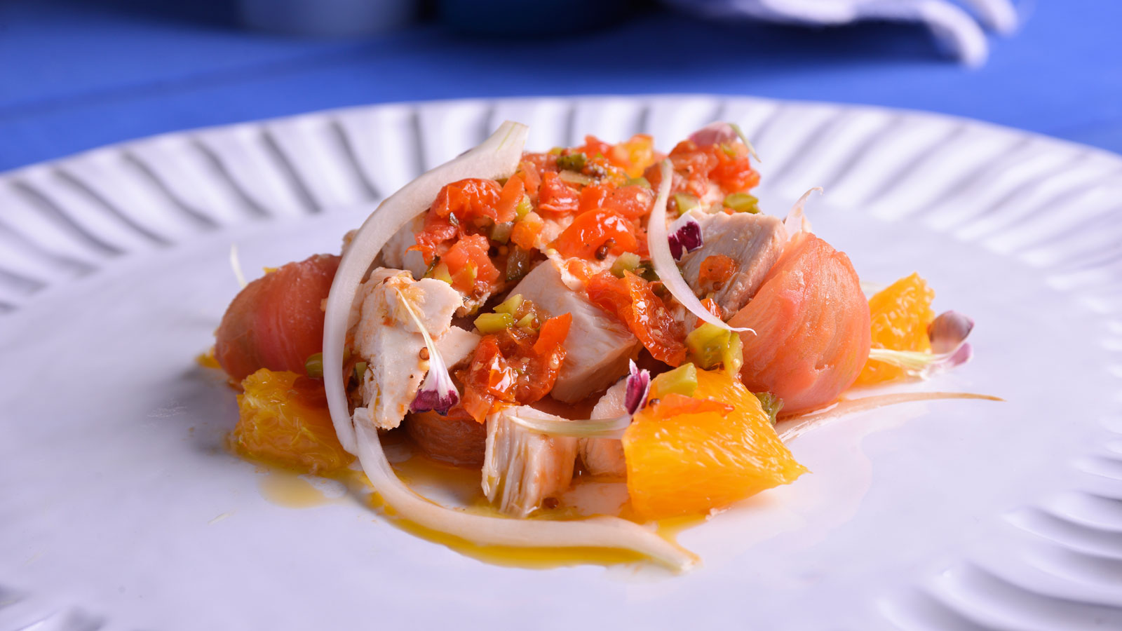 Emplatamos poniendo en la base el tomate, el bonito y la naranja en forma de flor. Lo regamos con nuestra vinagreta. Terminamos con la cebolla tierna y decoramos con una flor o dos de azahar.