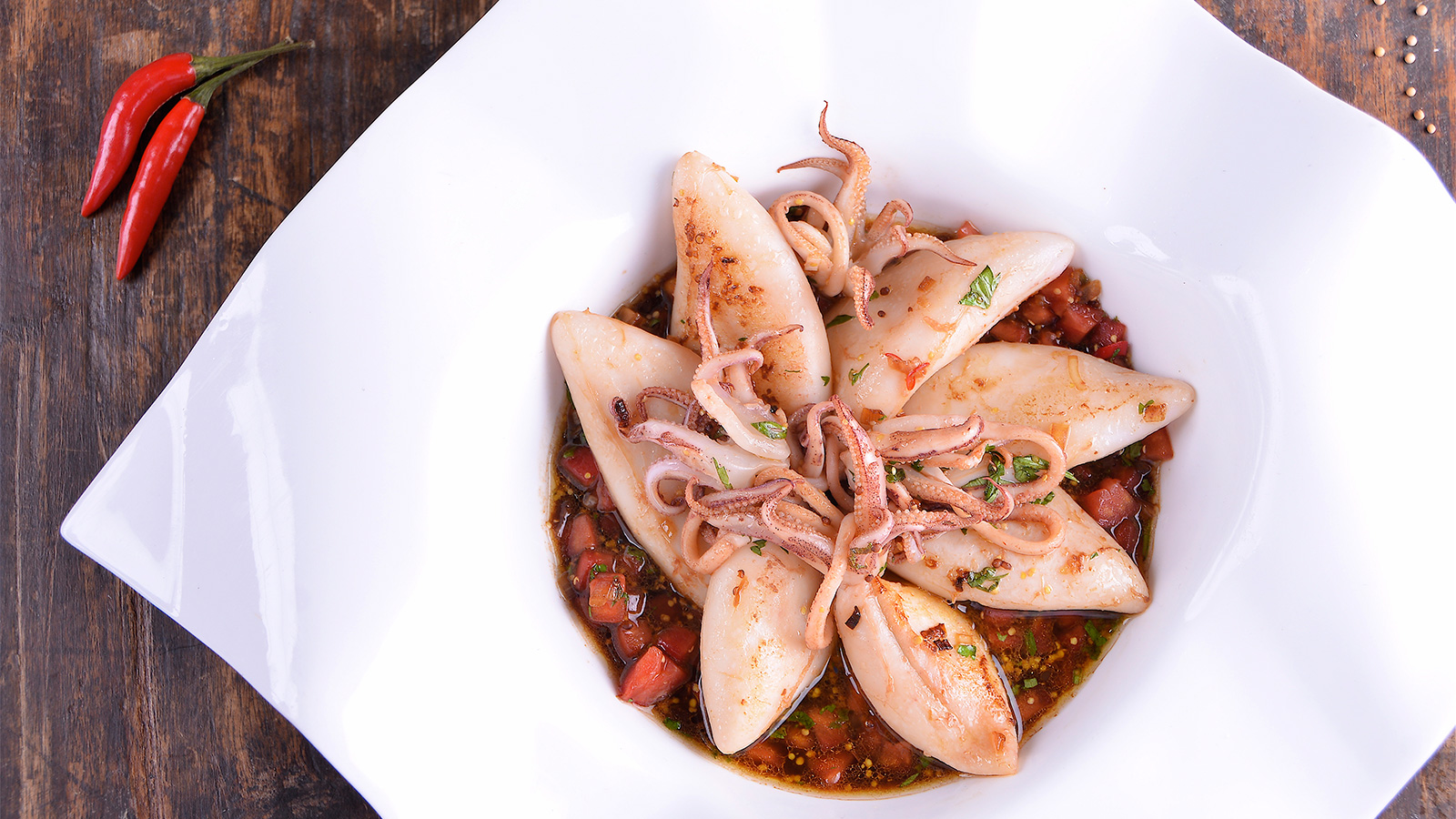 Emplatamos en la base del plato un poco de vinagreta y terminamos con los chipirones.