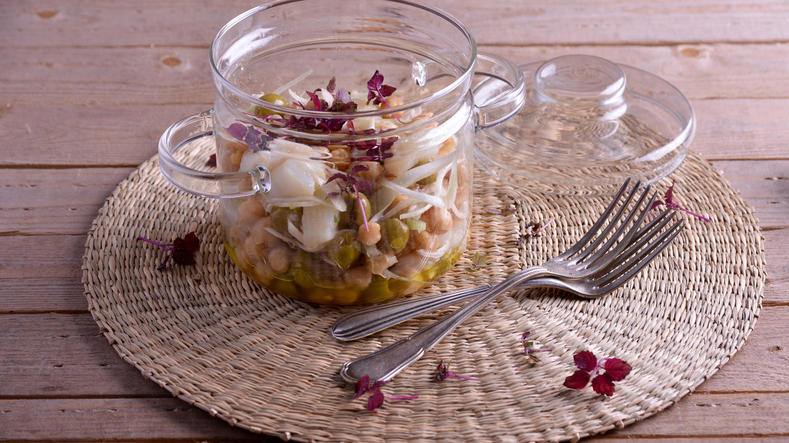 En un bol mezclamos el bacalao, la cebolleta, los garbanzos, las aceitunas y aliñamos con una mezcla de aceite de oliva, comino, albahaca, un chorrito de vinagre, pimienta y sal.