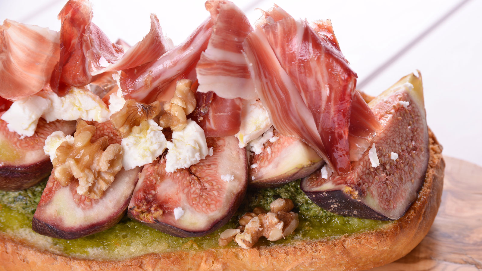 Untamos la crema de albahaca y queso crema dentro del pan. Colocamos los higos, lonchas de jamón ibérico, taquitos de queso feta y nueces.