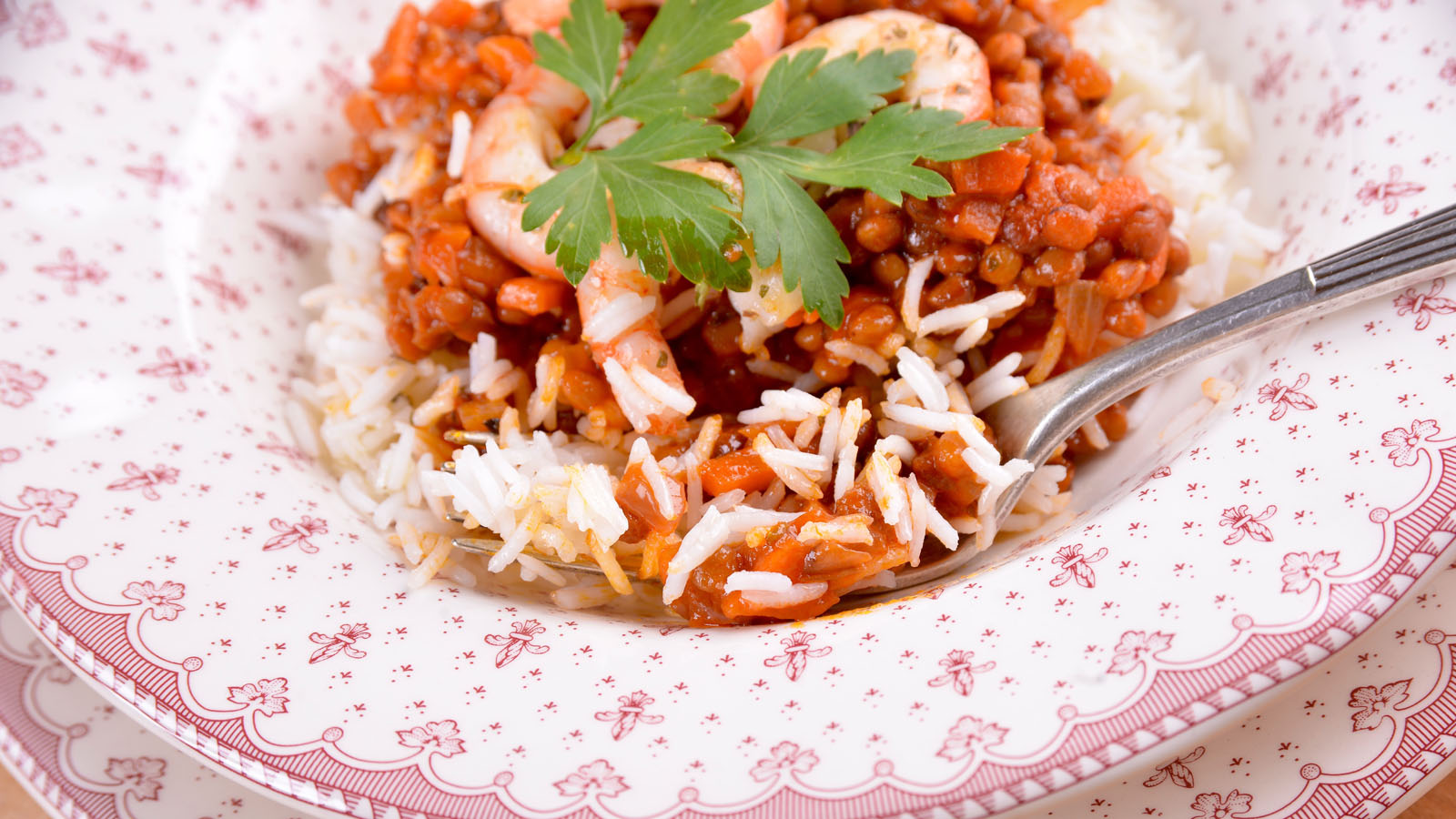 Para finalizar, disponemos el arroz basmati sobre una fuente y por encima echaremos el guiso de las lentejas. Por último colocaremos las gambas, una pizca de orégano, un chorrito de aceite de oliva y decoramos con hojas de perejil.
