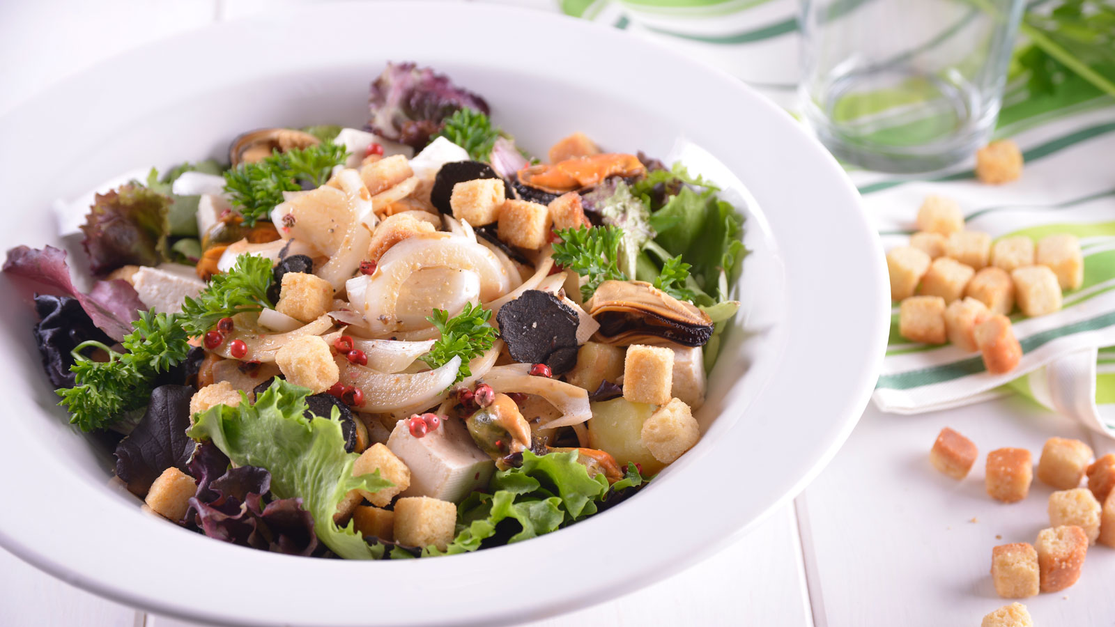 Emplatamos nuestra ensalada cubriendo el fondo del plato con los brotes de lechugas y distribuimos los croutons de pan integral, los cubos de patata, la cebolla, el tofu y los mejillones. Aliñamos con la vinagreta que hemos preparado anteriormente.