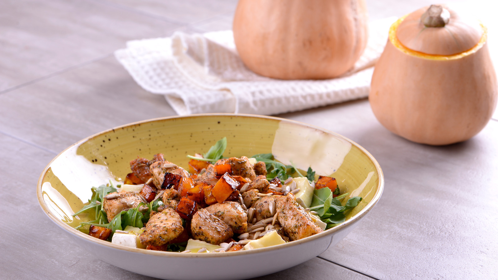 Ensalada de pollo con calabaza, rúcula y pipas