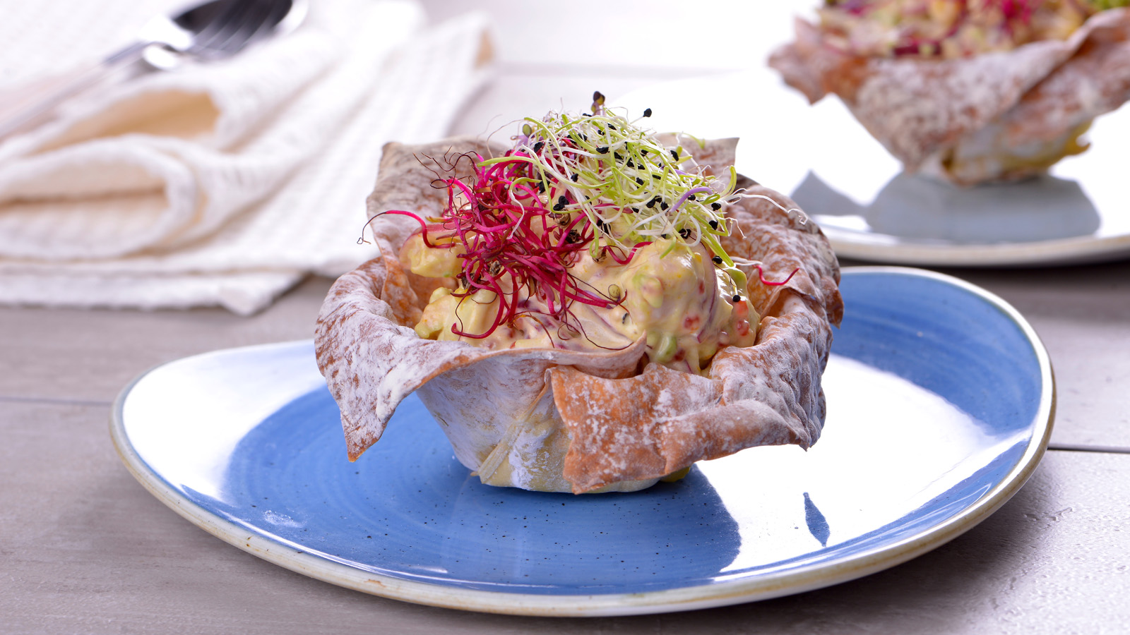 Rellenamos con la mezcla de nuestra ensalada de pollo y terminamos con un montoncito de germinados al gusto y unas gotas de aceite virgen.