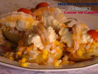 Partimos las patatas por las mitad y las ponemos en una fuente. Encima de cada patata ponemos una cucharada de la ensalada. Encima de la ensalada ponemos una cucharada de mayonesa y encima de cada patata ponemos dos langostinos ya pelados. Decoramos con los brotes.