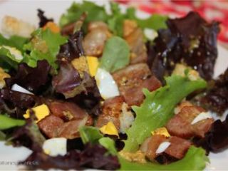 Para finalizar, en la misma sartén donde hemos dorado el bacon, añadimos las 2 cucharadas de mostaza y un poquito de pimienta molida, removemos bien durante unos segundos y retiramos del fuego. transcurridos unos minutos para que esta mezcla se haya templado, aliñaremos la ensalada con este aliño de mostaza y un chorrito de aceite de oliva. Por último rectificamos de sal.