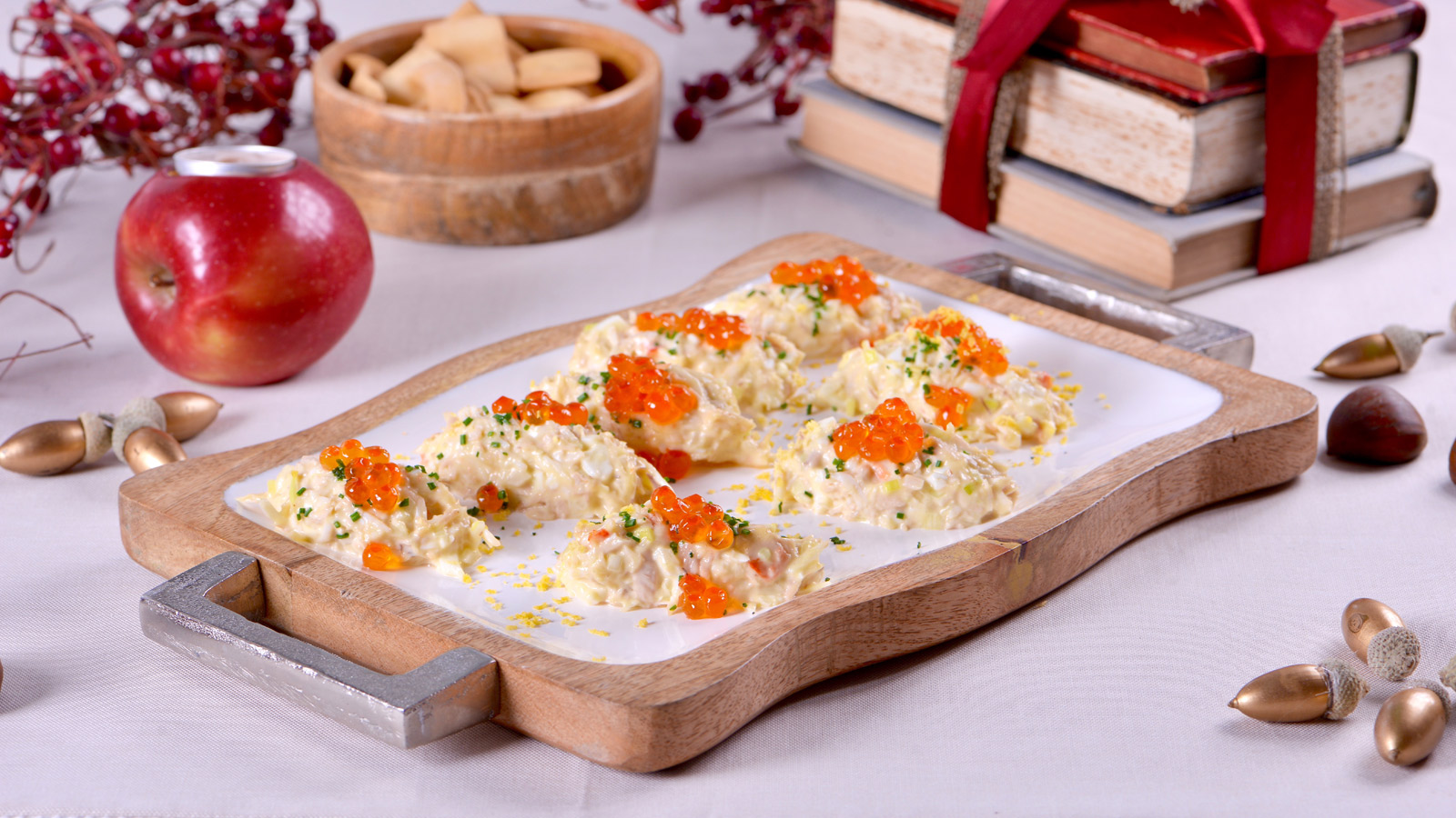 En el capítulo 1 del programa de televisión Platos fríos para celebrar, Pablo Vicari prepara la receta de Ensaladilla especial de bonito y huevas de salmón.