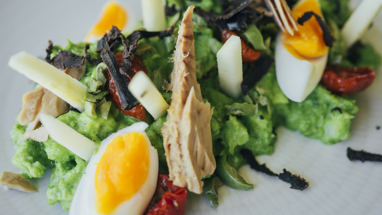 Servimos y decoramos con el tomate seco, unas aceitunas, el huevo picado, unos trozos de melva, el atún rallado y unos trozos de manzana.