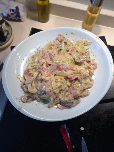 Pasamos la pasta por el escurridor y cuando la salsa se haya reducido un poco vertemos los espaguetis y el parmesano. Cuando el queso se haya fundido lo servimos.