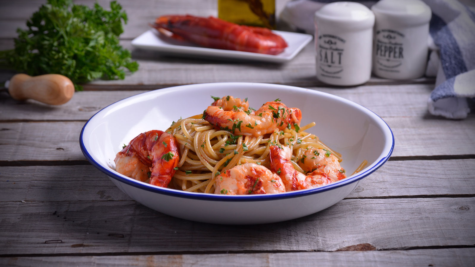 Emplatamos los espaguetis con los carabineros. Coronamos con el perejil picado y un poco de ralladura de limón.