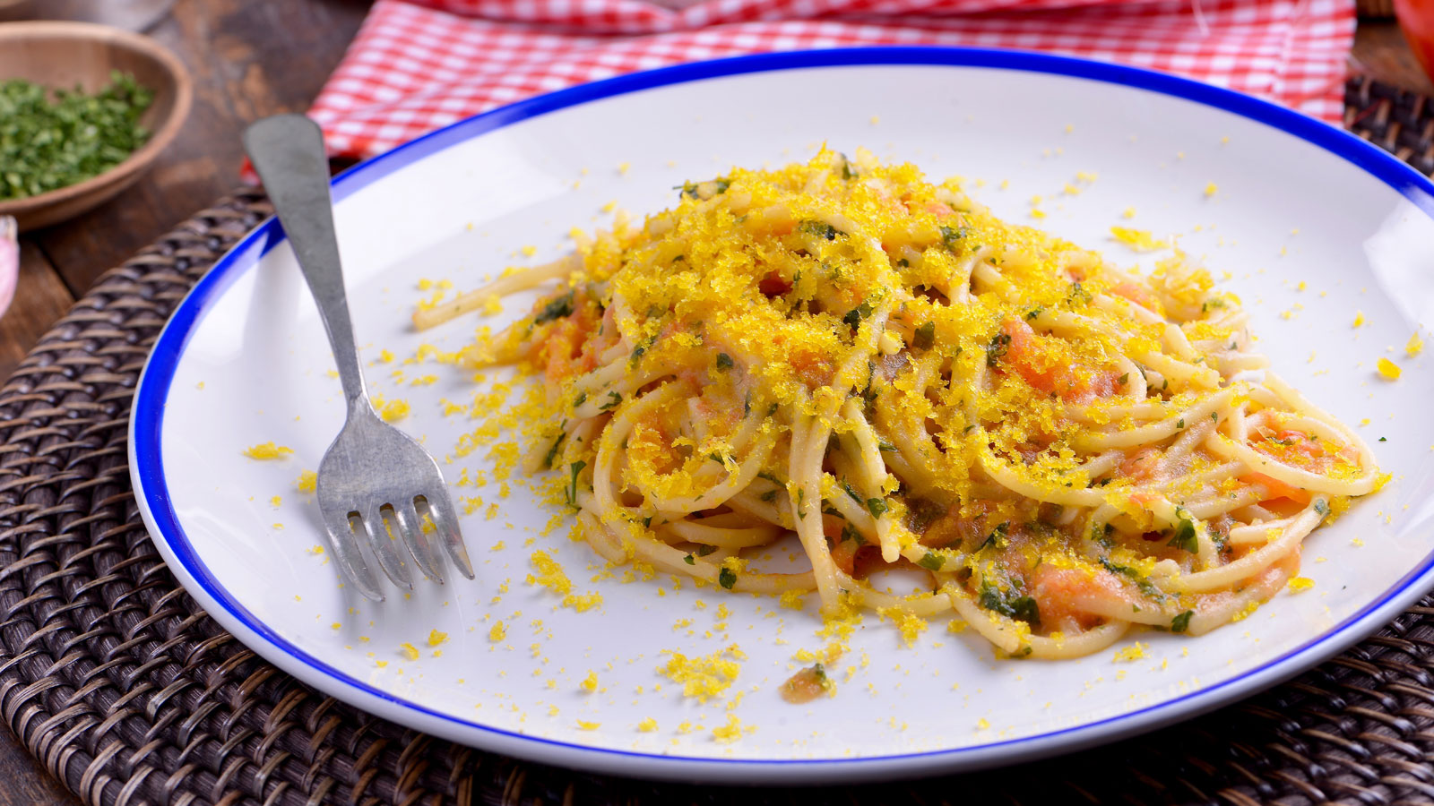 Espaguetis con tomate crudo y botarga (Spaghetti al pomodoro crudo e bottarga)
