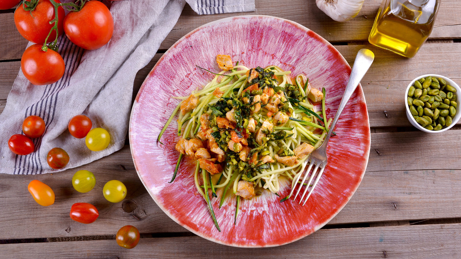 En el capítulo 2 del programa de televisión La cocina de la felicidad, Marta Simonet prepara la receta de Espaguetis de calabacín con vinagreta de pistachos.