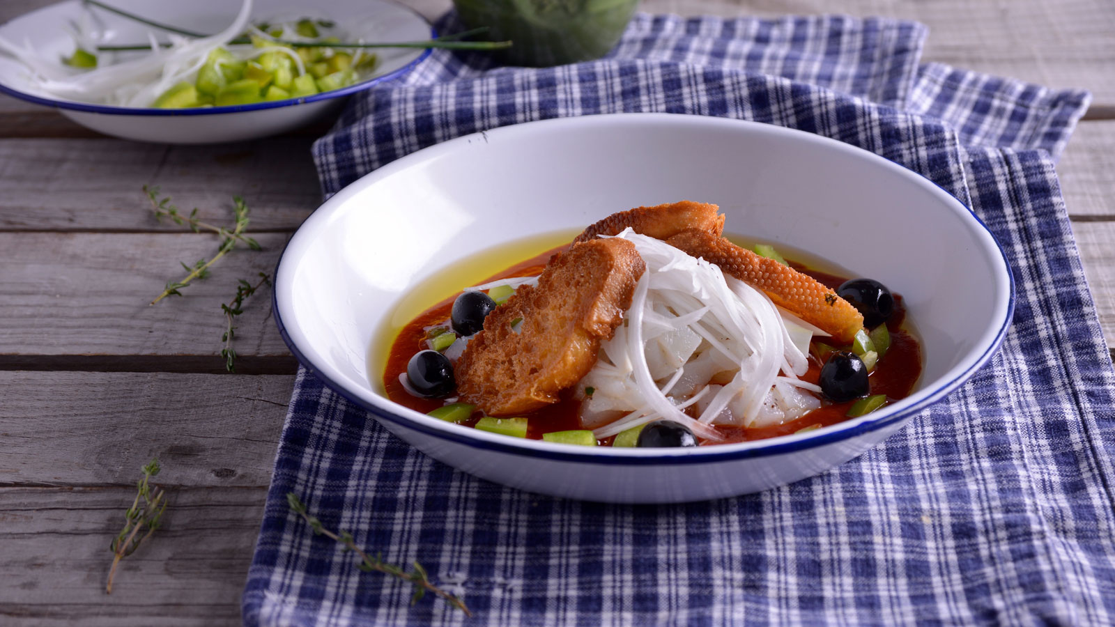 Distribuimos sobre nuestro plato las aceitunas, añadimos el tomillo, pimienta negra, el cebollino picado, un buen chorro de aceite de oliva virgen extra y terminamos acompañando con el pan frito.