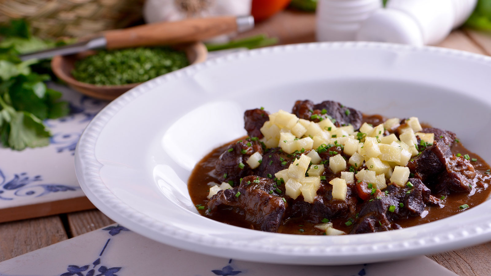 Servimos nuestro estofado de carne con las patatas y decorado con cebollino picado.
