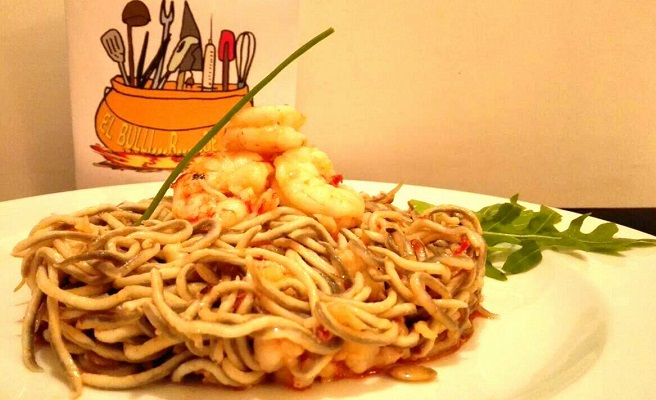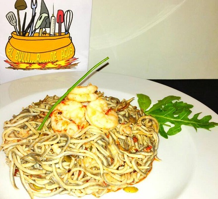Echaremos el sucedáneo de angulas moviéndolas para que no se peguen y añadiremos los gambones, unos troceados en rodajitas y otros enteros para decorar,