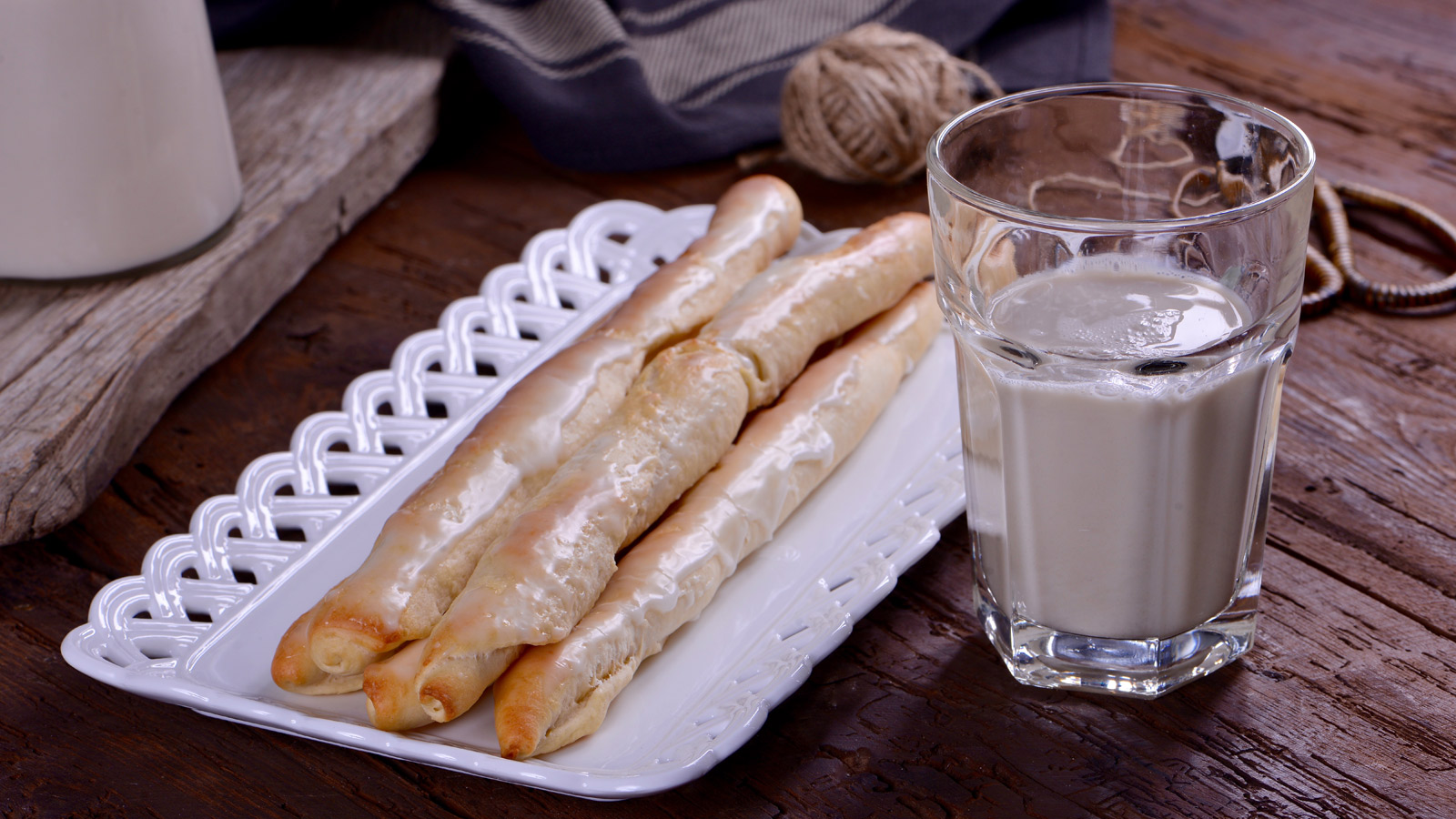 Con el rodillo, estiramos una porción, dándole una forma ovalada y enrollamos a lo largo. Tienen que quedar como un canutillo o barquillo. Los ponemos en una bandeja para el horno con papel de hornear.