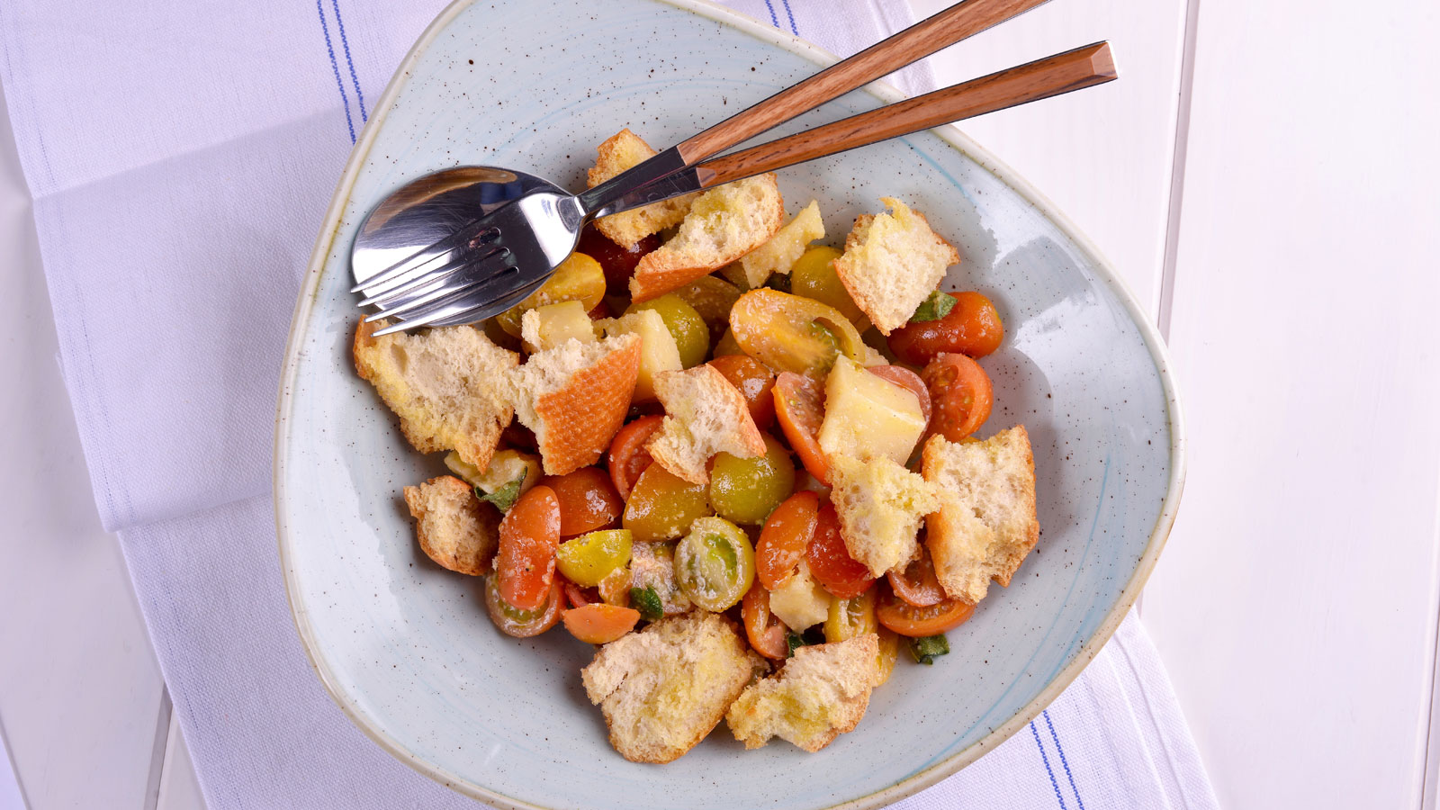 Emplatamos los tomates y esparcimos sobre ellos trocitos rústicos de parmesano.