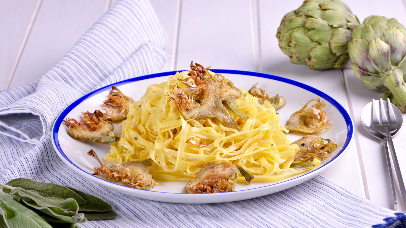 Servimos la pasta y acompañamos con las alcachofas crujientes, ralladura de limón y sal negra en escamas.