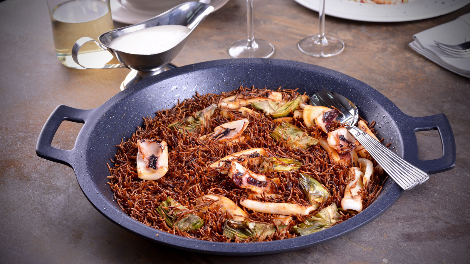 Llevamos a la mesa la paellera con la fideuá con cuidado de no quemarnos. Acompañamos el plato con el alioli casero que hemos preparado.
